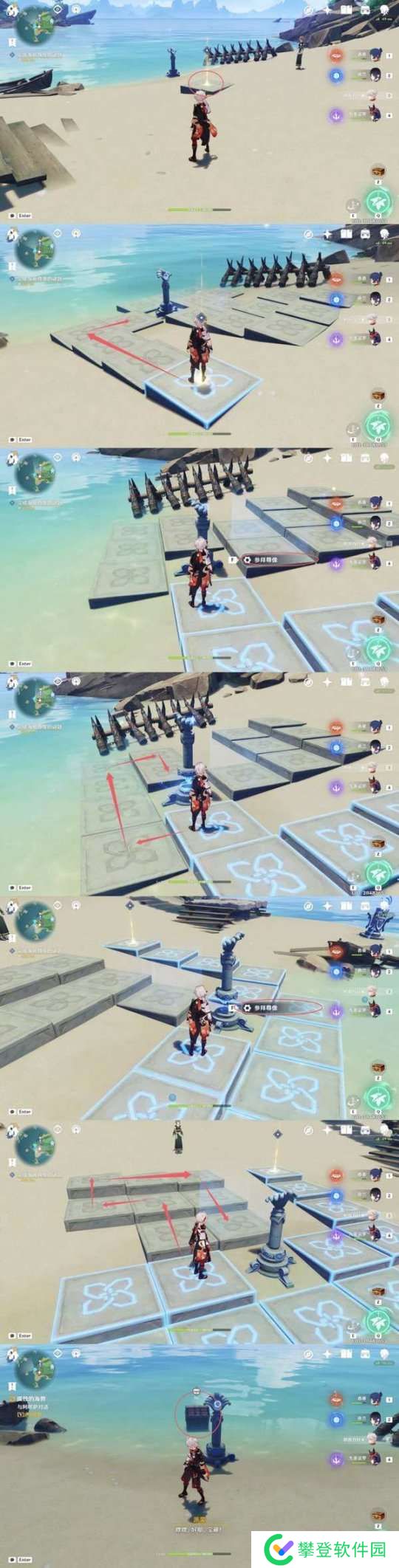 解锁石柱雕像之后,站在发光点处(建议先看完图片内容,再实际操作)完成解谜,中间靠近石柱会需要我们参拜使方块浮出(两次),通过正确的路程完成获得精致宝箱。