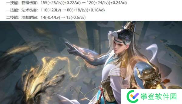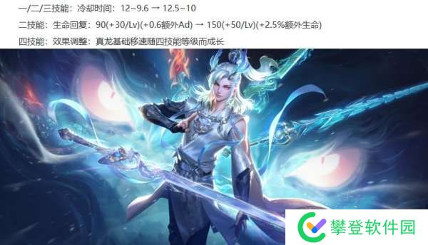 敖隐削弱:1/2/3技能的CD增加0.5~0.4秒,2技能的前期回血增加,且回血改为额外生命加成,4技能真龙的移速随技能等级变化。