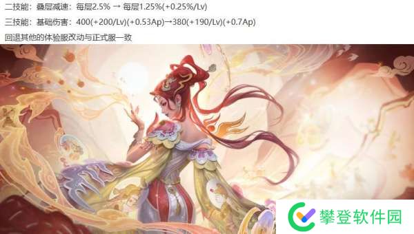 芈月削弱:2技能的减速效果前中期降低,后期减速不变,大招的前期伤害降低,后期伤害增加,回调其他改动。
