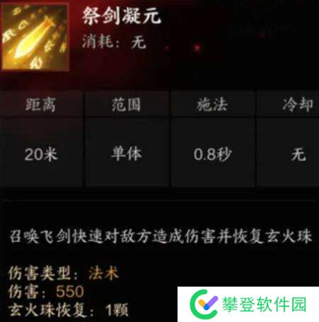 2、祭剑凝元:点出后替换驭火诀,单体技能,使用后恢复玄火珠
