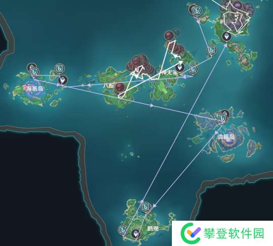 路段1,3,5,6,8分别为蒙德,璃月,稻妻,须弥,枫丹境内钓鱼点