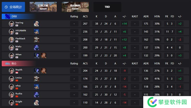下半场手枪局Knight冷静换位丝血反杀帮助BLG拿下手枪局。随后BLG依靠枪械优势继续拿分。第15回合DRX利用枪械优势连续击杀追回一分。DRX连续追分将比分反超,选择主动叫出战术暂停。暂停回来BLG选择对中路发难,whzy飘逸滑铲拿到3杀帮助BLG追平比分。第19回合nephh的三杀再次吹响BLG的反攻号角。第20回合DRX成功追分后,BLG选择叫出最后一个战术暂停。随后DRX连续拿分,率先拿到盘点。第23回合BLG面对枪械劣势成功追回一分。在常规时间的最后一回合前,DRX选择叫出第二个战术暂停。第24回合DRX利用终极技能先打出人数优势,在中路连续的对枪free1ng拿到三杀带领DRX先下一城。MVP给到free1ng。