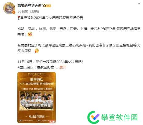 虎扑11月14日讯 狼队发布线下影院观赛城市:成都/青岛/上海在列,没有重庆