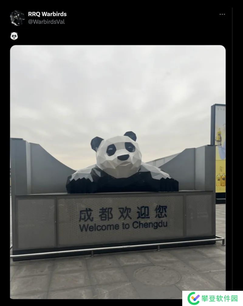 RRQ主教练Warbirds晒出抵达成都双流机场后的标志性大熊猫建筑。