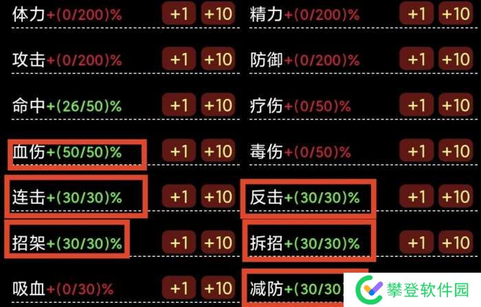 连击>招架>拆招>反击>减防>血伤>命中>攻击