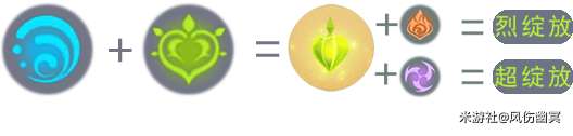 在这个阵容中,除了「超绽放」以外,「烈绽放」也是一个非常强大的组合。当水和草结合时,会在地上形成一个草原核,这时只需要使用火去接触地上的草原核,就能引发烈绽放的草伤范围爆炸!