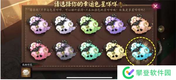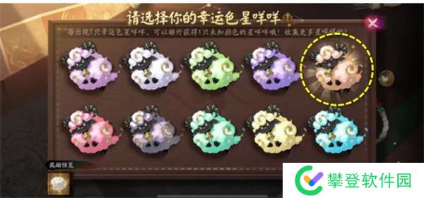 2、然后是选择幸运色星咩咩,这里有个小技巧,如果,如果一直选同一只羊,最后及格的概率不到50%,但如果在两种颜色的羊中反复横跳,间隔选择,胜率超50%以上的概率会大大提升,接近80%。