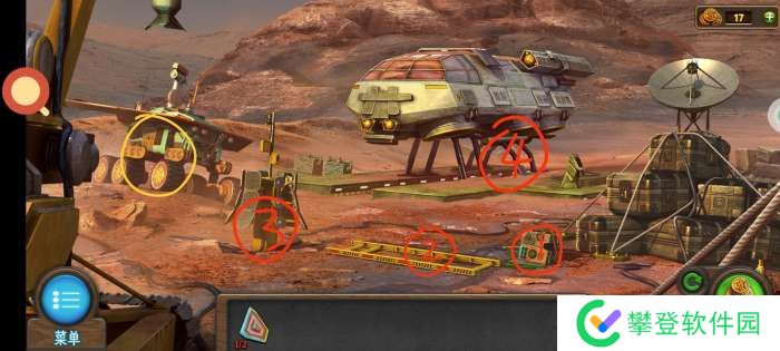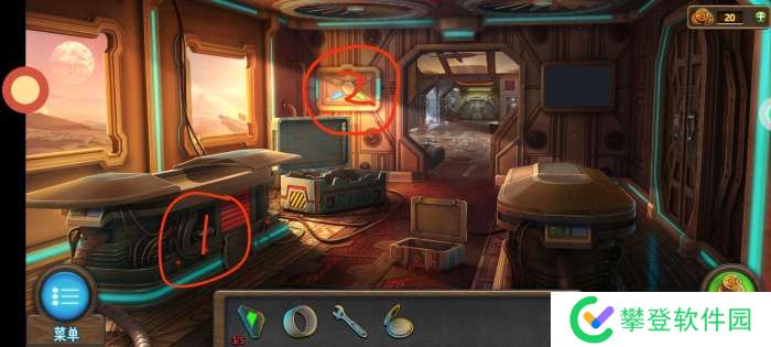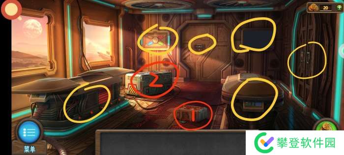 返回场景3,红圈处使用钥匙,完成小游戏,得到:①电池,②零件2。