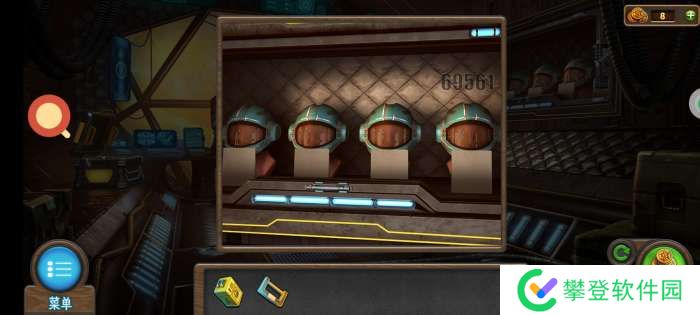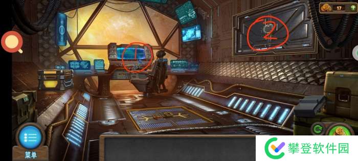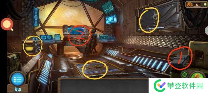 进入飞机,❶红圈1处用扫描器扫描,得到:带数据的扫描器。❷红圈2处用零件,完成小游戏,得到:把手。右上角数字69561记一下。