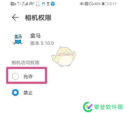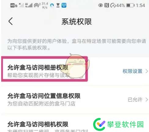 4、进入新页面,点击“允许盒马访问相机权限”。
