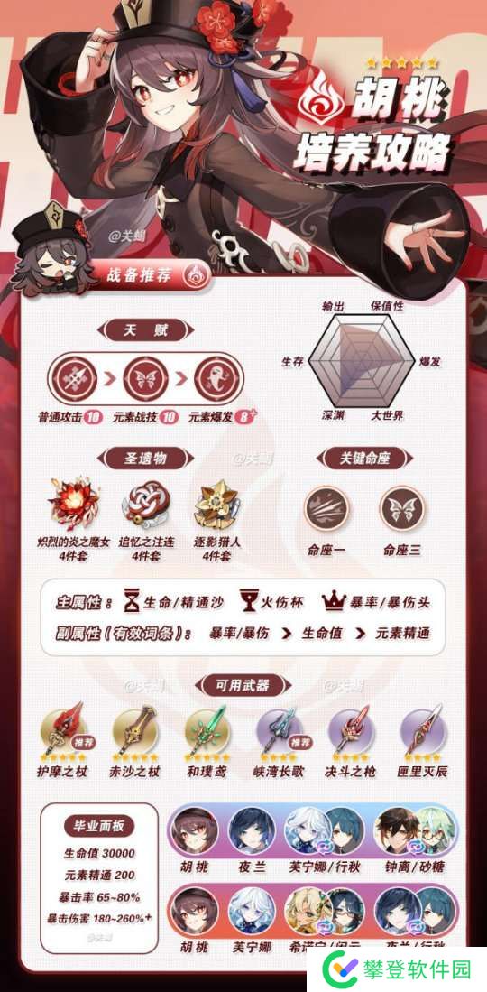 「胡桃」是一名五星火系长枪角色,擅长高爆发火系输出,在单打方面表现突出,主要靠释放元素技能后使用重击打元素反应造成伤害。操作难度较高,而由于其天赋机制的限制,在实战中需要控制血量才能达到最大输出,最佳状态下血量需压制在半血及以下。建议队友配备盾辅角色,以确保其生存和输出环境。