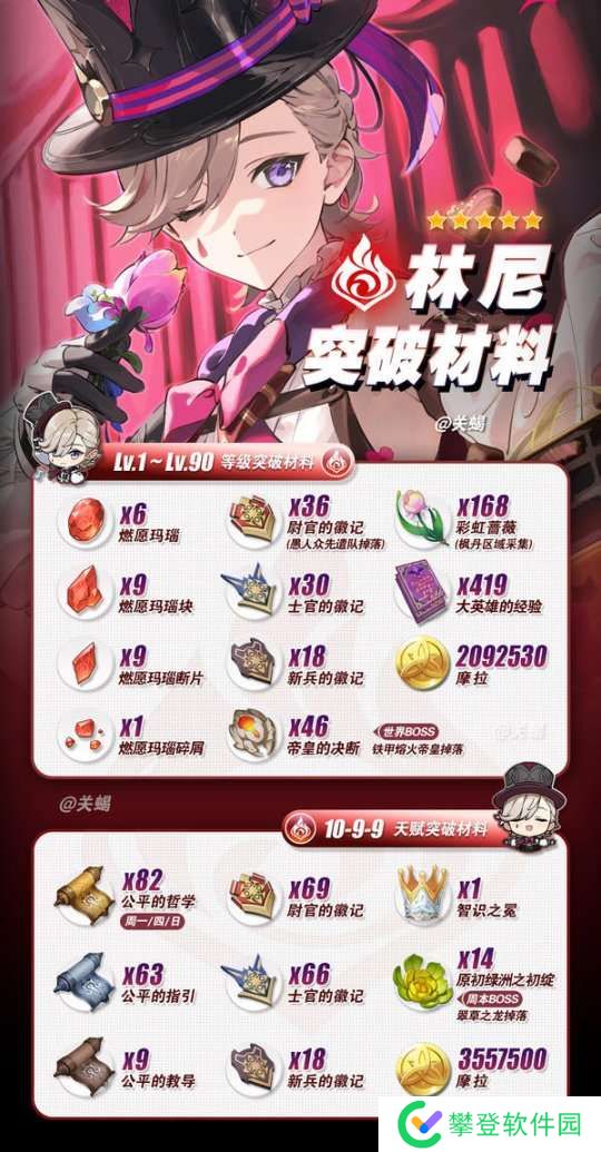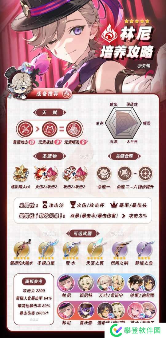 魔术师林尼是一位五星火系弓箭角色,其始基力为芒性,定位为驻场主C。林尼的主要输出方式是依靠二段重击蓄力箭叠层「隐具余数」,并施放技能引爆层数造成伤害。此外,林尼的元素战技自带扣血机制,也依赖蓄力重击。因此,推荐搭配具备治疗能力、护盾和抗打断能力的队友作为首选。如果队伍中有多名火元素角色,可以触发林尼固有天赋的效果,获得伤害加成。