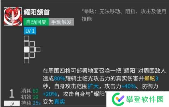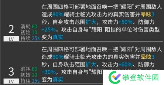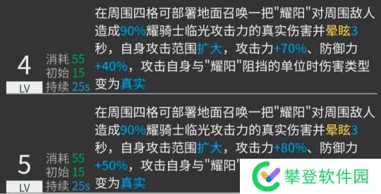 我的第二项技能是可以在周围四个格子内部署一把名为“耀阳”的武器。这把武器可以对周围的敌人造成110%的真实伤害,并使其晕眩3秒。同时,我的攻击范围也会扩大,攻击力增加至140%,防御力为100%。如果我攻击到被“耀阳”挡住的单位,也能够对其造成真实伤害。此技能需要初始SP值25,消耗SP值40,持续时间为25秒。值得注意的是,“耀阳”是一种召唤物,它有6000的生命值,攻击力为10,防御力为600,法术抵抗为20。只要你能把它安置得合理,它就可以成为一个强大的防御援助,因为它既结实又能够挡住两个单位。