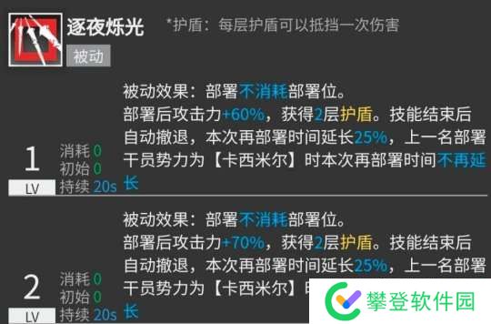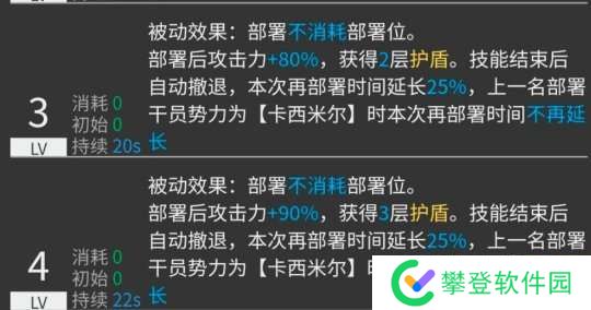 智能小帮手二技能是被动效果,部署不需要消耗部署位并且会在部署后拥有160%的攻击力和4层护盾。技能持续27秒并且在结束后会自动撤退,同时再部署时间会延长25%,但如果上一名部署干员是卡西米尔,则不会延长再部署时间。与蓝蒂相比,智能小帮手的二技能相当于加强版。