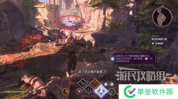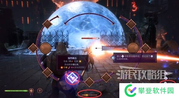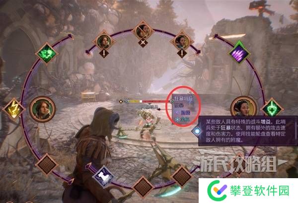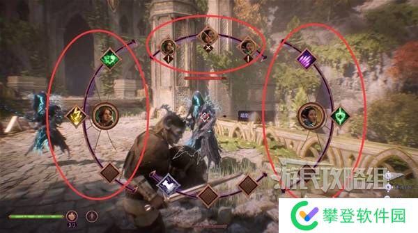 技能轮盘的左侧和右侧分别是两位同伴的技能,下方是自己的技能,上方是可指挥队友做的操作。