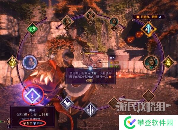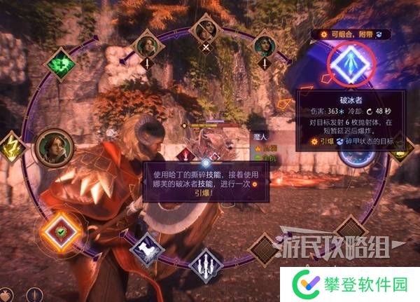 有些技能可以组合使用,比如先选中哈丁的撕碎技能(可对敌人施加碎甲状态),再选中娜芙的破冰者技能(可引爆碎甲状态的敌人),实现引爆。