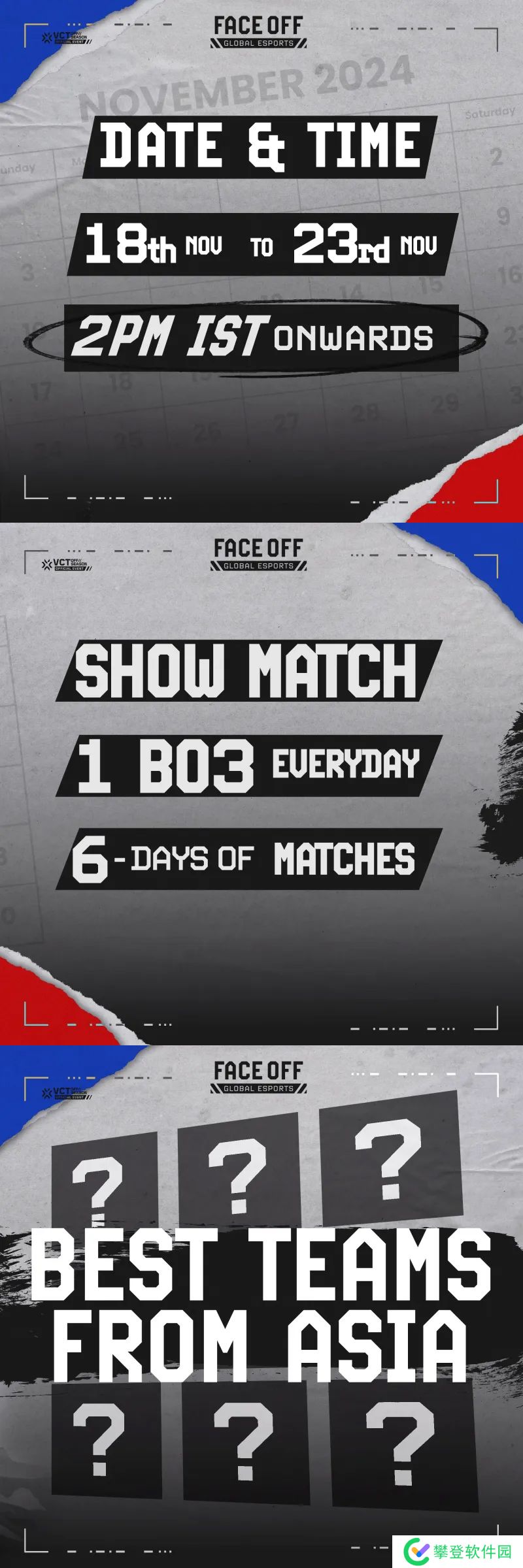 VCT 太平洋联赛的战队Global Esports官宣将举办休赛期锦标赛“Face Off”。比赛日期为2024年11月18日至2024年11月23日,为期六天,每天将举办一场BO3,将邀请六支来自亚洲的最优秀的队伍。