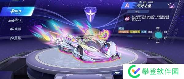 从六维性能图来看,天外之星各项属性均优秀,基础属性中集气方面极出彩,搭配实用的赛车特性,适合在竞速赛中驾驶。