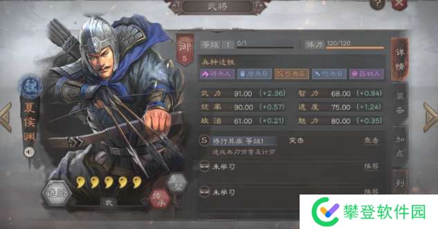 夏侯渊的智力和速度还可以,武力、统率、魅力都比较高,**就比较一般,他旗下的骑兵和弓兵都是S级别,器械擅长是A级别,但是盾兵和枪兵就只有B了。