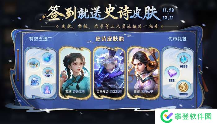 3、对应的优先级顺序是:随机史诗皮肤奖池、局内特效5选2奖池、金币铭文钻石大礼包(含金币18888、铭文6888、钻石888)。