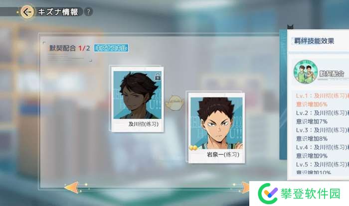 三、岩泉一和及川彻上阵激活默契配合羁绊,双方的意识会获得额外增加,他们在动漫中也是有着比较出色的配合的。岩泉一无论是扣球还是接球的能力在ssr中都是相当出色的,搭配上进攻节奏buff,每一击都很难让敌人招架的住,而京谷又需要搭配岩泉一来互相增加强攻属性,所以这套搭配基本上就是养岩泉一。