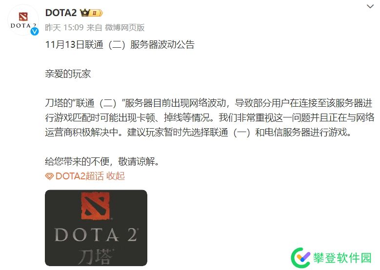 亲爱的玩家:刀塔的“联通(二)”服务器目前出现网络波动,导致部分用户在连接至该服务器进行游戏匹配时可能出现卡顿、掉线等情况。我们非常重视这一问题并且正在与网络运营商积极解决中。建议玩家暂时先选择联通(一)和电信服务器进行游戏。给您带来的不便,敬请谅解。
