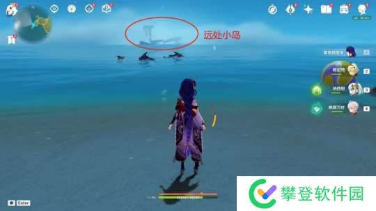 2.随后我们会在岸边看到鳍游龙,我们利用附身,游到对面的小岛上去