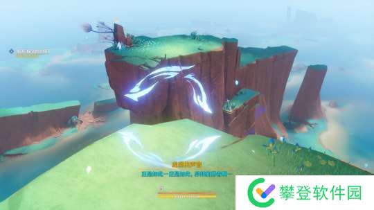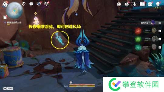 6.当我们来到山脚下以后,长按瞄准如图的涂鸦,即可创造出风场,帮助我们前进