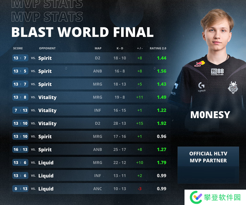 随着G2在BLAST 世界总决赛的决赛中3-0击败Spirit,HLTV也随之公布本届赛事的MVP选手,G2的明星狙击手m0NESY获此殊荣。这也是m0NESY在今年第三次获得HLTV颁布的MVP奖牌。