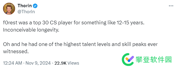 在瑞典传奇选手f0rest宣布退役后,英国知名电竞记者Thorin在个人社交媒体账号上对f0rest致敬并给出高度评价。