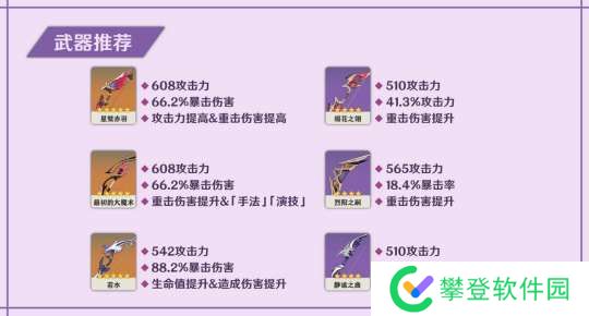 本期武器池中的限定四星弓缀花之翎是最优选择,攻击力副属性没有太大压力,而特殊效果的增伤提升也相当大。月卡武器烈阳之嗣在理论上的攻击力也很不错,但由于需要考虑对单与暴击率副属性的配平,存在一定限制性。