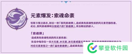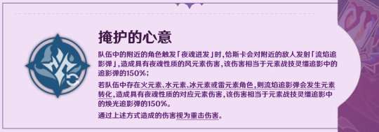 恰斯卡的元素爆发发射形式类似于提纳里,是一个主弹(风)+6发分裂弹(火/水/雷/冰),每有一名火/水/雷/冰角色就能染色2发分裂弹,算是一个补伤害/过渡真空期的技能。