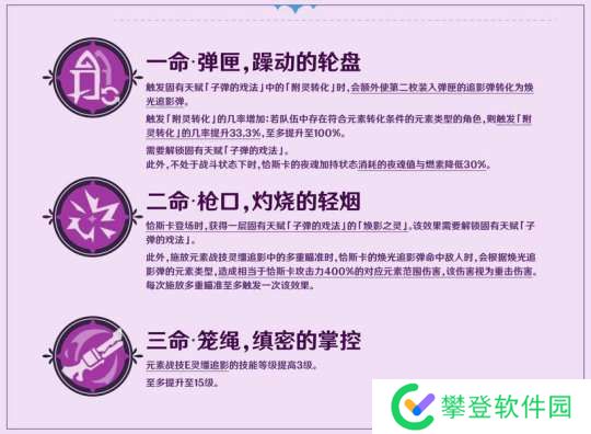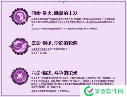 最后接下来是恰斯卡的命座,三命、五命加天赋等级就不赘述了,我们主要看看其他几个命座。