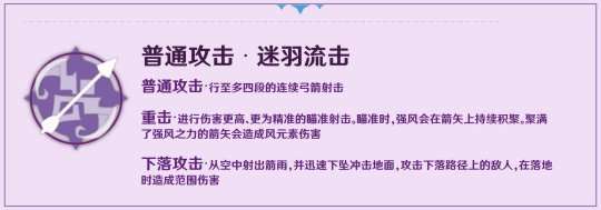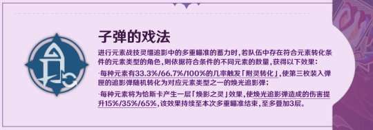 前两个子弹是固定的风元素弹,第三个子弹是可以通过角色的天赋1“子弹的戏法”进行转化的。转化后的子弹类型不确定,但后面x个子弹都是固定的染色弹。 在携带了x名不同元素的火、水、雷、冰队友时,第一个子弹也会变成对应元素的风弹。所有子弹的附着都是弱元素,风弹的附着CD为1.5秒,而染色弹的附着则遵循1.5秒/2次攻击的规律。