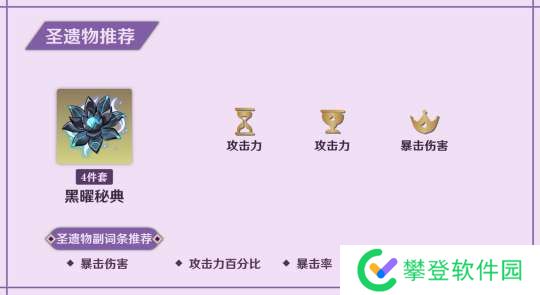 圣遗物的首选是黑曜秘典四件套,因为它能提供15%的普攻重击增伤和40%的暴击率,这些属性都可以轻松被吃满。如果你还没有刷出黑曜套,那么逐影猎人四件套可以作为过渡套装,记得在队伍中携带芙宁娜。逐影猎人四件套提供15%的增伤和36%的暴击率,这个收益也相当不错,和黑曜套仅有一个词条的差距可以忽略不计,实际战斗中几乎没有数值上的区别。除此之外,风套和勇者套也适用于某些特殊情况下的选择,比如队伍中有多个副D并且他们的练度较高。