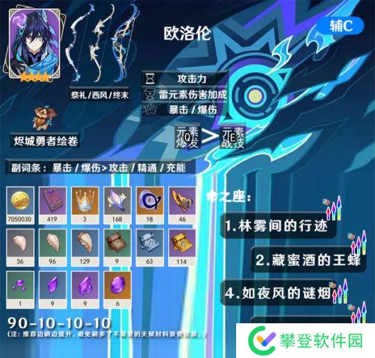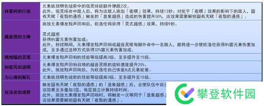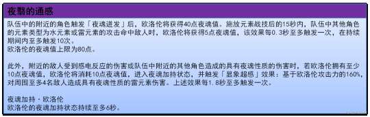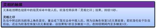 施放元素战技后,15秒内,队伍里的水/雷角色命中敌人时还可以继续小回复欧洛伦的夜魂值,15秒内可以恢复10次。