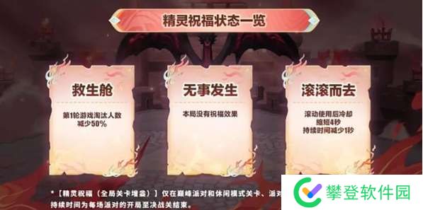 精灵祝福的种类有很多,可以提供增益效果,但是每局只会随机生成一种,并且当局的所有玩家都是相同的。