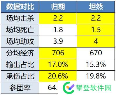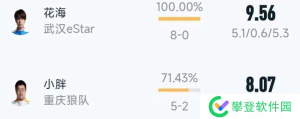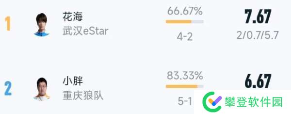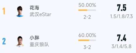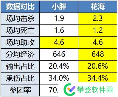 两位选手都是本届年总个人数据相当恐怖的打野,花海这边KDA、场均击杀、场均助攻、输出占比、承伤占比五项数据位列第一;小胖场均助攻第一,输出占比、承伤占比位列第二,与花海都只差零点几个百分点。