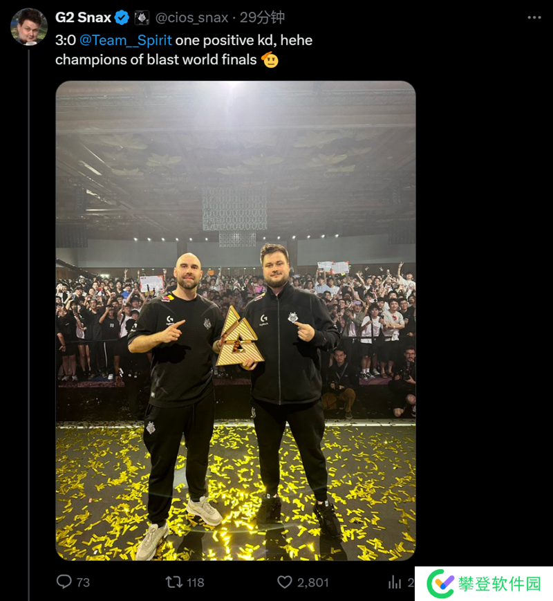 Snax:3-0 Spirit。其中还有一张图是正K/D。BLAST 全球总决赛冠军。