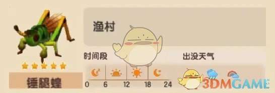 心动小镇锤腿蝗只会出现在渔村任何时间和任何天气都可以捉到,捕捉媒介是灌木丛、铁质长花坛、芦苇和地面,刷新时间很快,只有一分钟,警戒时间只有10秒钟,还没有找到锤腿蝗的小伙伴可以参考小编整理的《心动小镇》捶腿蝗快速捕捉位置和时间攻略,相信大家看完之后一定可以快速收集并丰富自己的图鉴。