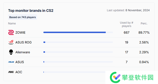 根据Prosettings数据显示,737位CS职业选手中89.77%正在使用卓威显示器,其他品牌占比按序降低分别为:华硕ROG、外星人、华硕、AOC,使用AOC显示器的仅有4人,占比0.54%。