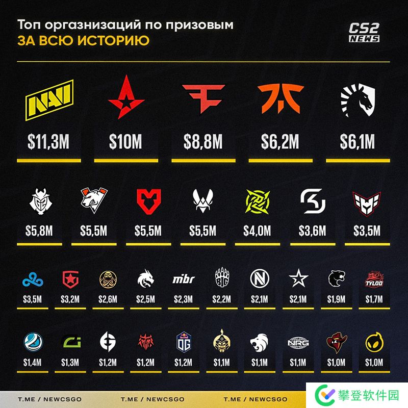 外媒统计了迄今为止在CS(包括CSGO和CS新版本)这个项目上获得百万美金奖金的队伍名单,其中