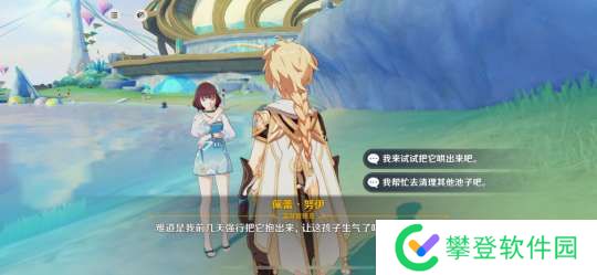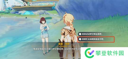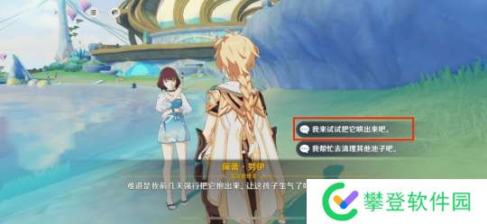 对话得知,由于她要打扫温泉池子,没空照顾贪玩的鳍游龙,无法兼顾,需要我们帮忙,有两个选择