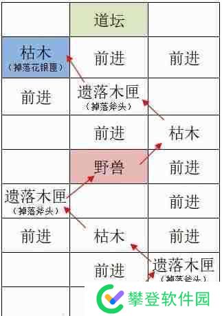 2、树林:前进-遗落木匣(掉落斧头)-枯木-遗落木匣(掉落斧头)-击败野兽-枯木-遗落木匣(掉落斧头)-枯木(掉落花银匣)-道坛