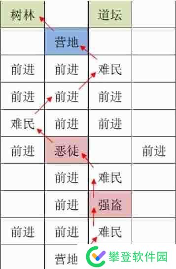 1、难民营:营地-难民-击败强盗-难民-击败恶徒-难民-前进中-难民-营地-树林