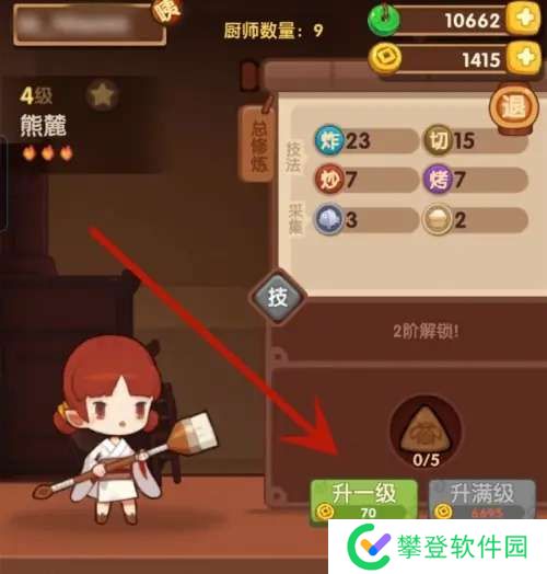 4、厨师升级之后点击他的技法,再点击升满级按钮提高技法的属性即可。