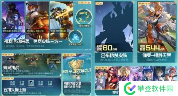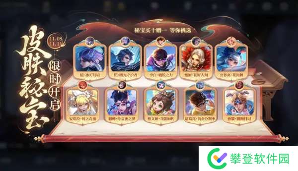 11月8日至11月11日,会上架全新的皮肤秘宝,价格为20点券和50点券,前者有机会开出史诗皮肤,后者则有机会开出传说皮肤。