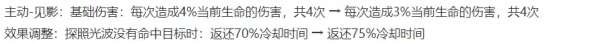 主要是灼烧伤害从4%下调至3%,而作为补偿,也把没有照到敌人的CD返还,从70%提升至75%。