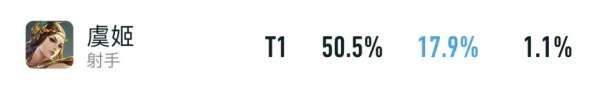 也正因如此,虞姬在顶端局里,才能有着50.5%胜率+17.9%出场率的亮眼表现,优先级排到了前五名。