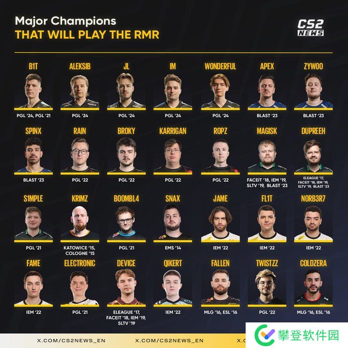 外媒统计了本次参加RMR的所有选手中曾经获得过Major冠军的选手,老A队王朝成员dupreeh、Magisk、device以5座与4座Major冠军奖杯领跑榜单,老将KRIMZ、FalleN、coldzera与在新老阵容的